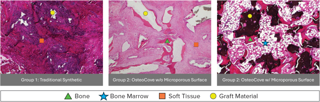 We compared a traditional synthetic, β-TCP, as a control, to OsteoCove, both with and without the microporous surface. As expected, no bone formation was seen with the traditional synthetic, whereas OsteoCove, with the intact microporous surface, not only generated mineralized bone, but developed bone marrow as well. Demonstrating that it was the surface that led to the formation of well-developed bone tissue.1
