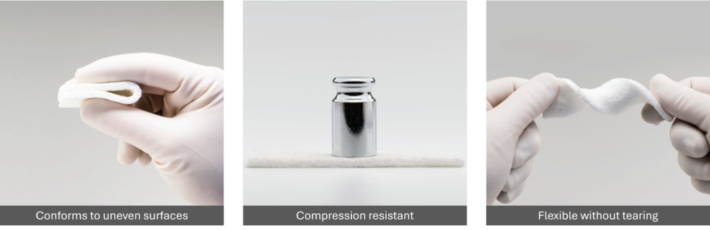 - Embeds granules within a cross‑linked collagen scaffold, giving it strength, flexibility, and resistance to compression