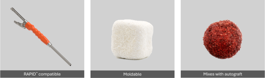 The putty was designed to fill and mold around anatomy and hardware, resist irrigation, and yet not stick to gloves. We chose the reverse phase medium (RPM) carrier we use in Accell™ Evo3 Putty that has received great surgeon feedback. It gels at body temperature, and has a tailored resorption intended to minimize irrigation and graft migration. There’s also type-I bovine collagen in the putty that our surgeon design team agreed enhanced the handling.1