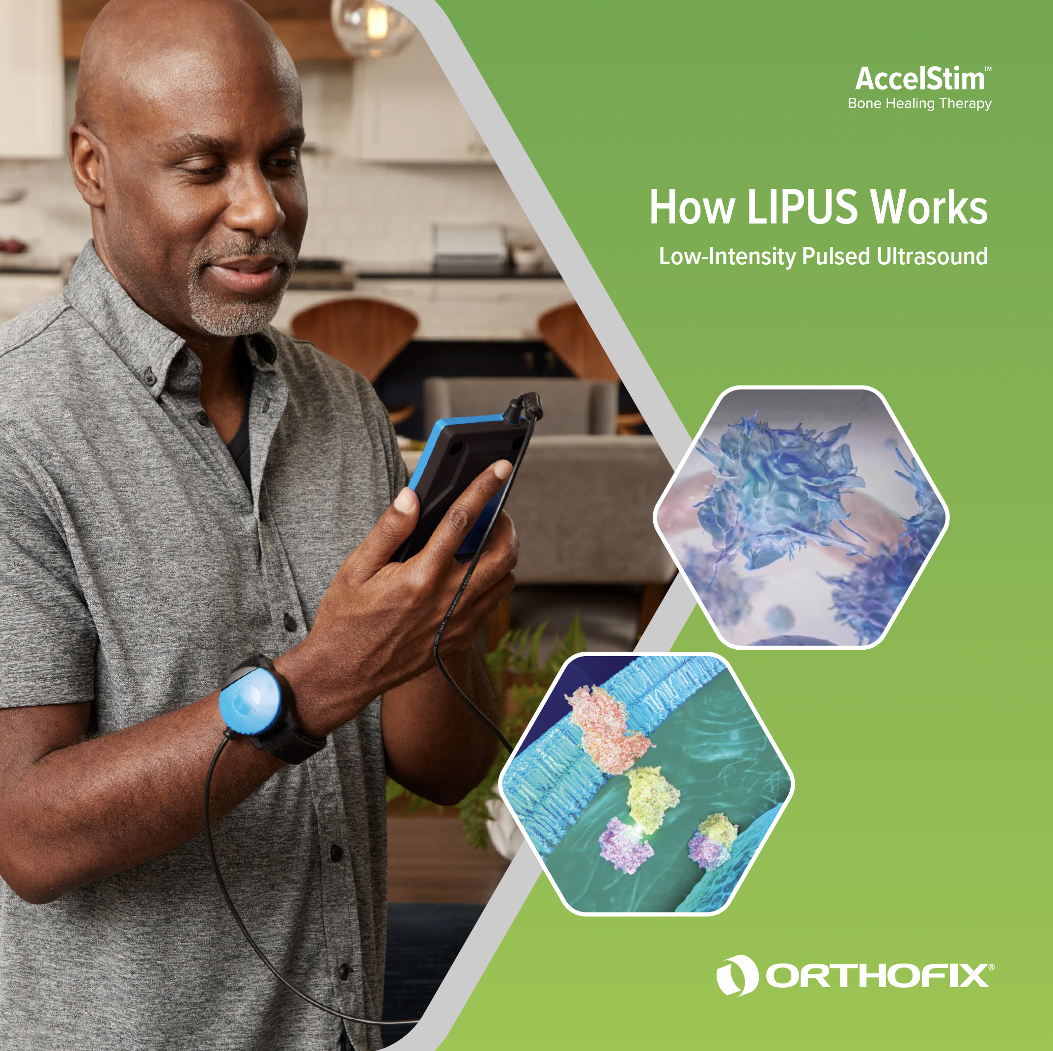 The AccelStim™ device delivers a low-intensity ultrasound signal directly to the fracture site using a coupling gel, ensuring a treatment experience with minimal or no sensation for the patient. 2-4 Research, both in vitro and in vivo, has demonstrated that low-intensity pulsed ultrasound effectively stimulates cells to produce essential growth factors and proteins critical for bone healing.